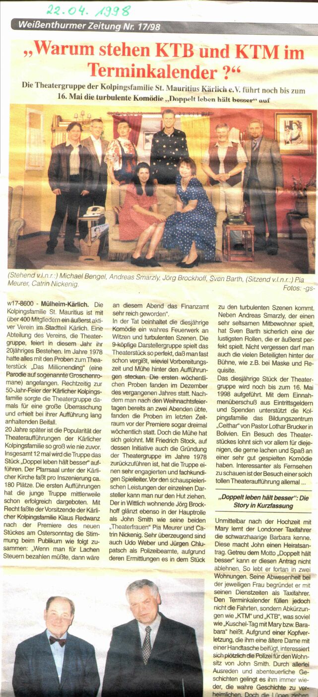 Bis zum allerletzten Platz ausverkaufte Vorstellungen und eine zusätzliche Aufführung zum Ende der 20. Spielzeit bestätigten Friedrich Stock und seiner Kolping-Theatergruppe, daß sie mit ihrer Komödie "Doppelt leben hält besser" den Geschmack des Publikums voll und ganz getroffen hatten. Selten wurde im Pfarr-saal unter der Kärlicher Kirche so viel gelacht wie in dieser Theatersaison.