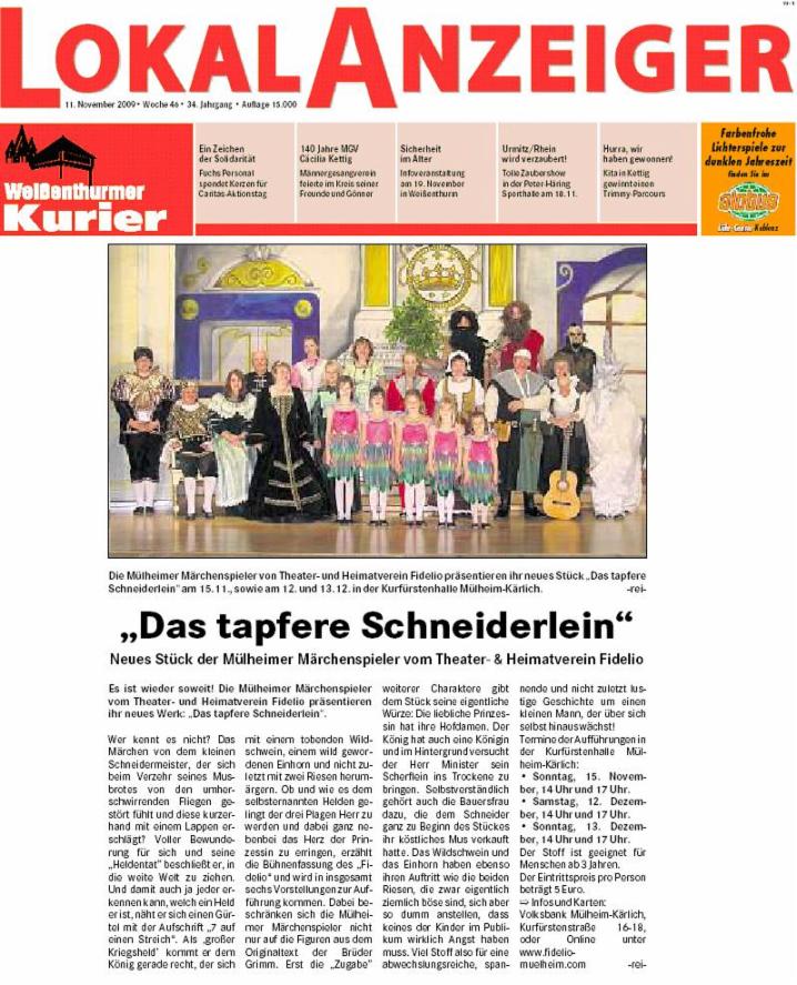 Ende des Jahres 2009 spielten die Mülheimer Märchenspieler des Theater- und Heimatverein Fidelio das Märchen „Das tapfere Schneiderlein“ (Gebrüder Grimm).